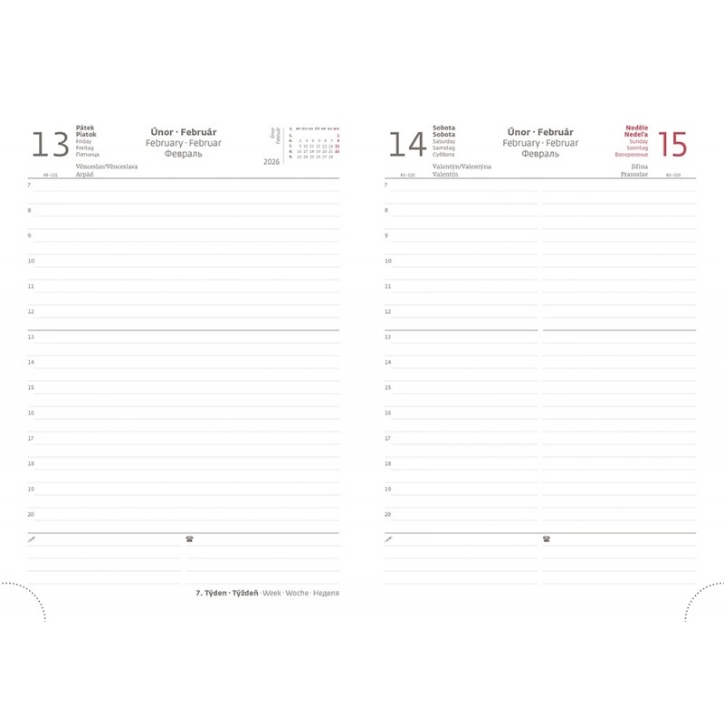Povrch diáře je zhotoven z univerzálního materiálu na bázi zušlechtěného papíru, který díky své jemné struktuře získává vzhled koženky. Doporučujeme ražbu přes fólii, případně potisk povrchu sítotiskem. Diář obsahuje: osobní údaje, plánovač dovolené (měsíční přehled), plánovací kalendář, telefonní předvolby, státní svátky České a Slovenské republiky, mezinárodní svátky, roční výhled, denní layout, adresář, mapa Evropy a České a Slovenské republiky