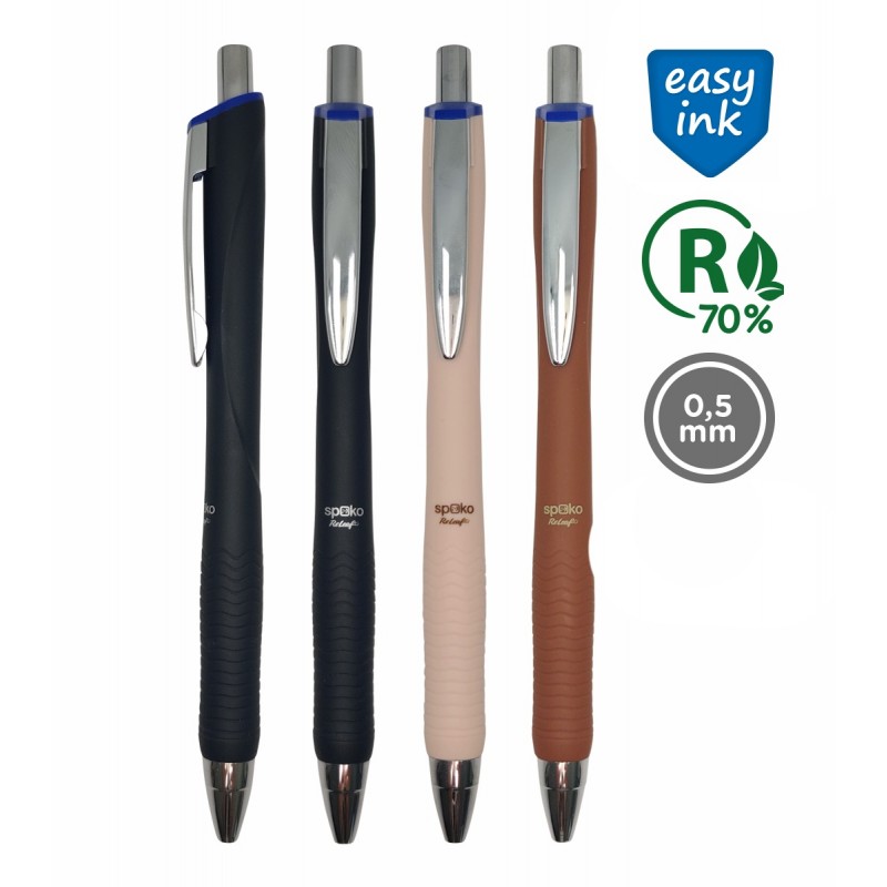 Lehké plastové kuličkové pero s náplní pro pohodlné psaní. Mix netradičních barev - světlá béžová, hnědá a černá. Šířka stopy 0,5 mm.