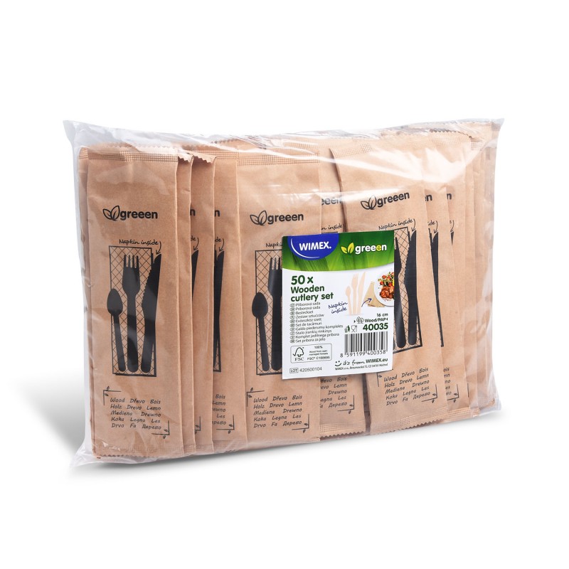 Dřevěný nůž + vidlička + kávová lžička hygienicky balené/50ks 40035