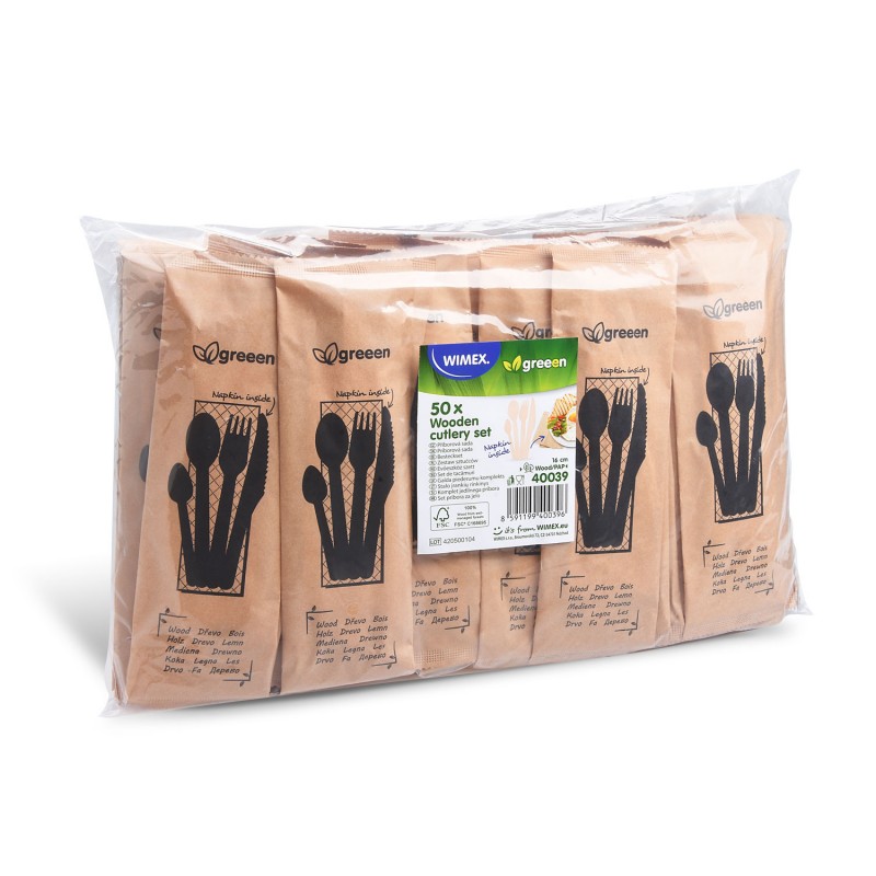 Dřevěný nůž + vidlička + lžíce + kávová lžička hygienicky balené/50ks 40039